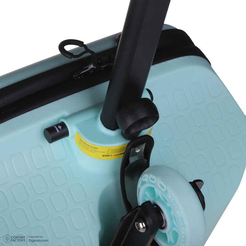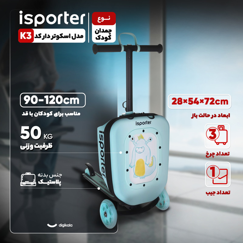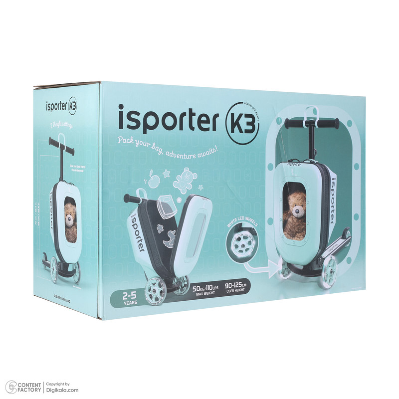 ابعاد در حالت باز : 72×54×28 سانتی متر دارای زیپ افزایش گنجایش دارای دو حالت تنظیم ارتفاع فرمان وزن قابل تحمل 50 کیلوگرم مناسب برای کودکان با قد 90 تا 125 سانتیمتر