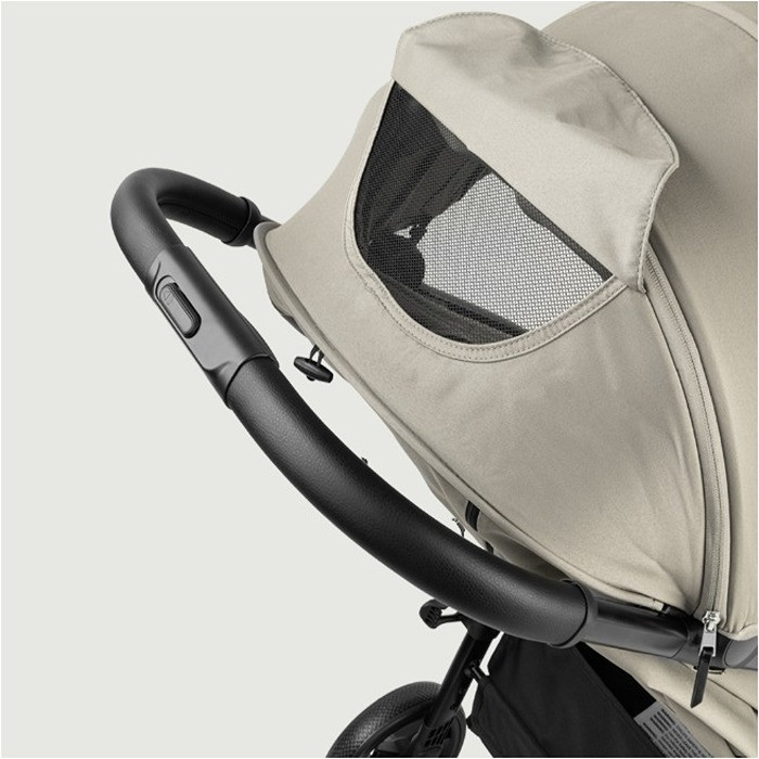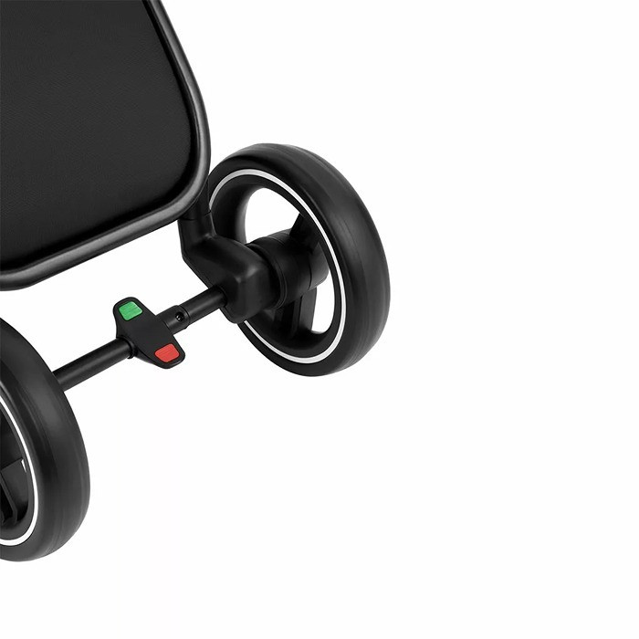 چرخهای جلو با چرخش ۳۶۰ درجه و چرخهای عقب با سیستم تعلیق مستقل، حرکت نرم و بدون لرزش را ممکن میسازند. ترمز یکپارچه عقب نیز کنترل کالسکه را سادهتر میکند. سایبان بزرگ کالسکه دارای دو حالت زیپی و مگنتی است که امکان تنظیم کامل پوشش و محافظت از کودک در برابر نور و باد را فراهم میکند.
