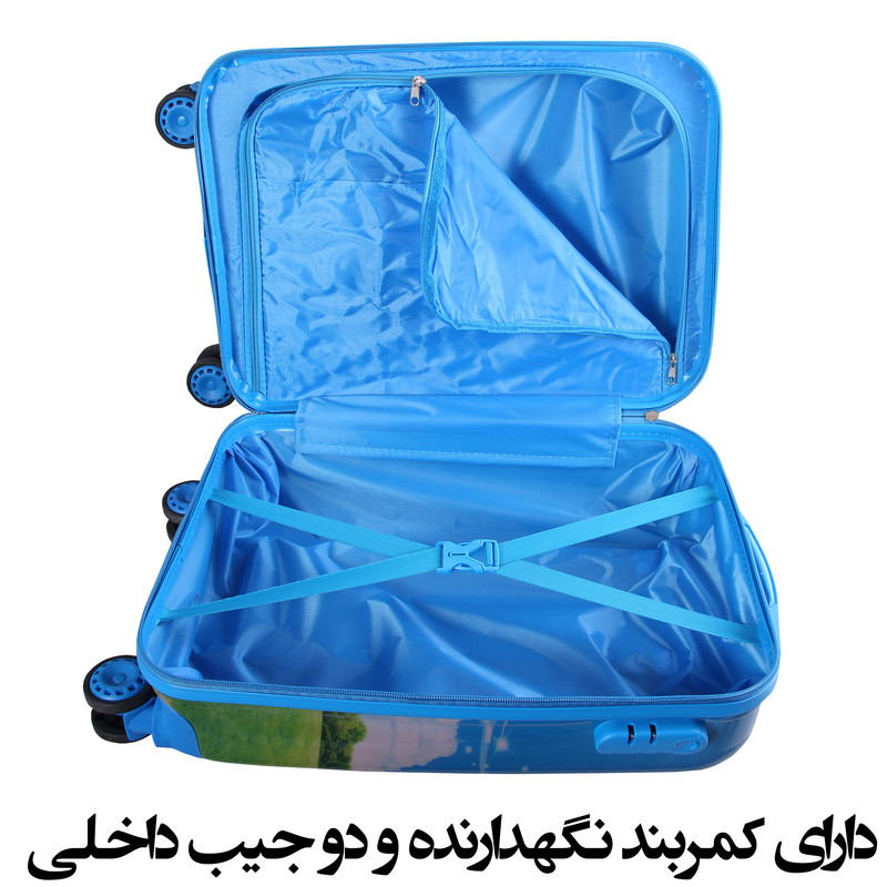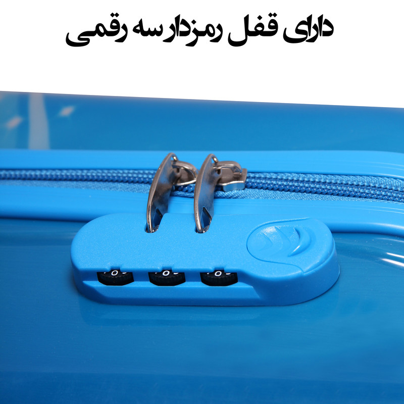 دارای چهار چرخ با قابلیت چرخش 360 درجه دارای یک دسته تلسکوپی برای حمل به صورت تراولی یک دسته برای حمل به صورت دستی دارای قفل رمز داره سه رقمی دارای آستر ساتن دارای یک روکش سلفونی بر روی بدنه چمدان که می توان جدا نمود