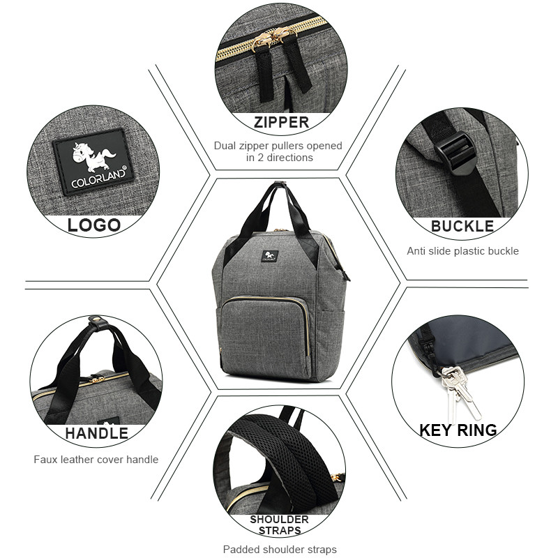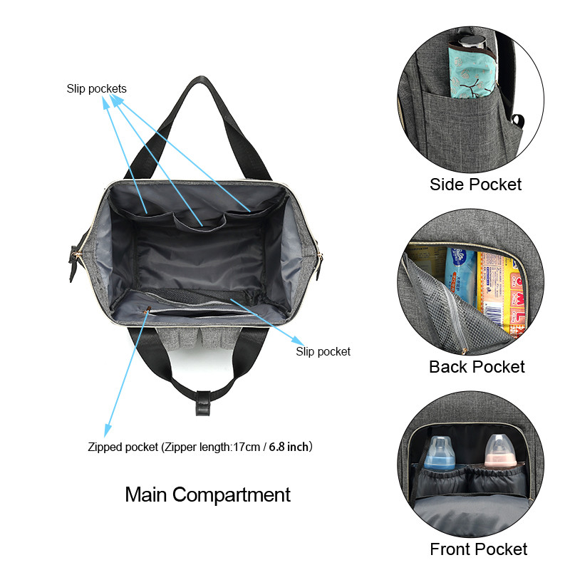 دارای زیرانداز تعویض دارای دو جیب در طرفین ساک لوازم دارای جیبهای مجزا در داخل کوله دارای یک جیب با بست زیپی جلو کوله دارای یک زیپ در پشت ساک لوازم برای دسترسی راحتتر به داخل کیف