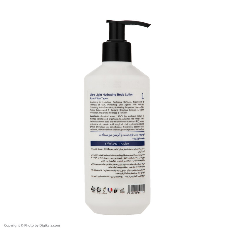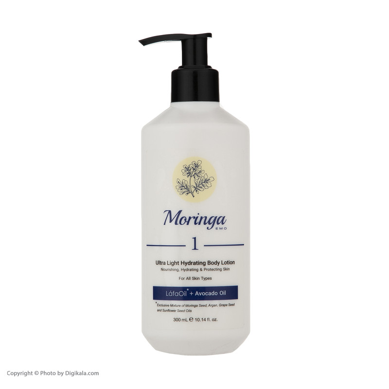 لوسیون بدن فوقسبک و آبرسان مورینگا امو 1 با قدرت آبرسانی بالا و جذب سریع، به عمق پوست نفوذ کرده و رطوبت آن را حفظ میکند. این لوسیون با تغذیه پوست، شفافیت و شادابی آن را افزایش داده و در برابر نور خورشید و آلودگیهای محیطی از آن محافظت میکند. همچنین با تحریک تولید کلاژن و الاستین، به پیشگیری از چینوچروک و افتادگی پوست کمک میکند.