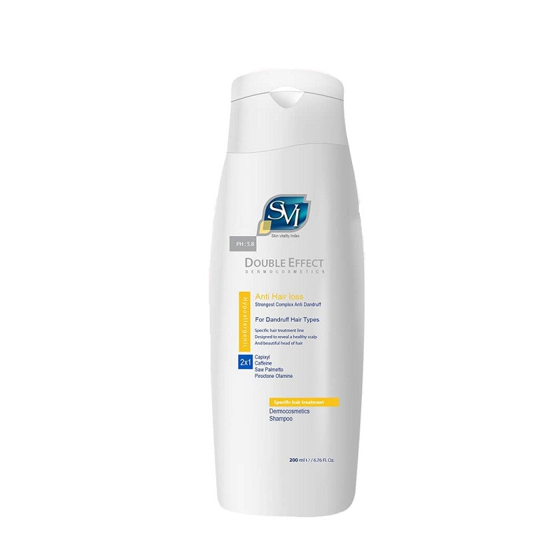 شامپو دبل افکت اس وی آی شامپویی است مناسب برای درمان همزمان ریزش مو و شوره کف سر، این فرمولاسیون منحصر به فرد سبب افزایش گردش خون محیطی، تامین مایحتاج تغذیه ای فولیکول مو شده و همزمان به دلیل وجود مواد ضد شوره موجود در آن به خوبی به کنترل شوره کمک خواهد نمود.