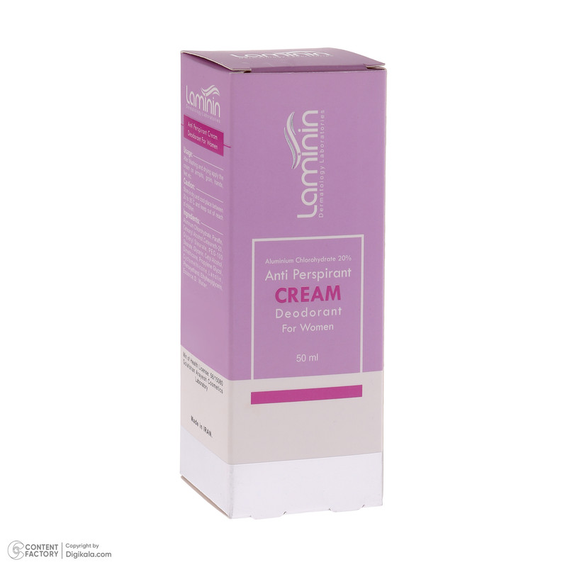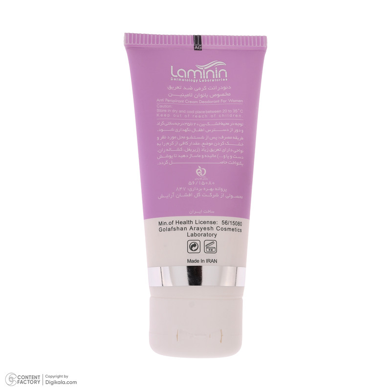 عرق کردن یکی از واکنشهای مفید بدن است و خود به تنهایی بویی ندارد و در همسایگی با باکتریهاست که باعث ایجاد بوی ناخوشایند میشود. کرمهای ضد تعریق لامینین ((Laminin یک گروه از دئودرانتها هستند که از ایجاد بوی بد پیشگیری میکنند و میزان عرق کردن در قسمتی که از کرم استفاده شده را کاهش میدهند. کرم ضد تعریق لامینین را میتوان در زیر بغل که از مرطوبترین و گرمترین قسمتهای بدن است و یا حتی سایر نقاط مانند کشالهی ران و کف دستها استفاده کرد. در ترکیبات این کرم از آلومینیوم کلروهیدرات استفاده شده که تعریق را کاهش میدهد و محیط مرطوب و مناسب رشد باکتریها را از بین میبرد. ترکیبات با پایهی آلومینیوم در این کرم باعث تحریک الکترولیتهای عرق میشود و میتواند مجرای خروجی غدد عرق را ببندد که به خشک ماندن سطح پوست کمک میکند. کرم ضد تعریق لامینین بدون ایجاد اثر چربی و چسبندگی باعث نرم شدن پوست میشود و با قدرت جذب و ماندگاری بالا و رایحهی مطبوعی که دارد تا ساعتها محل استفاده را خشک نگه میدارد. بهترین زمان استفاده از ضد تعریقها پس از استحمام و یا شستشوی محل مورد نظر است که با مالیدن کرم و ماساژ آن بر روی پوست به ماندگاری و تاثیر بیشتر آن کمک میکند. میزان pH این کرم در حد طبیعی و ساظگار با انواع پوستها است و در دو نوع زنانه و مردانه با رایحهی دلنشین و در حجم 50 میلی لیتر عرضه شده است.