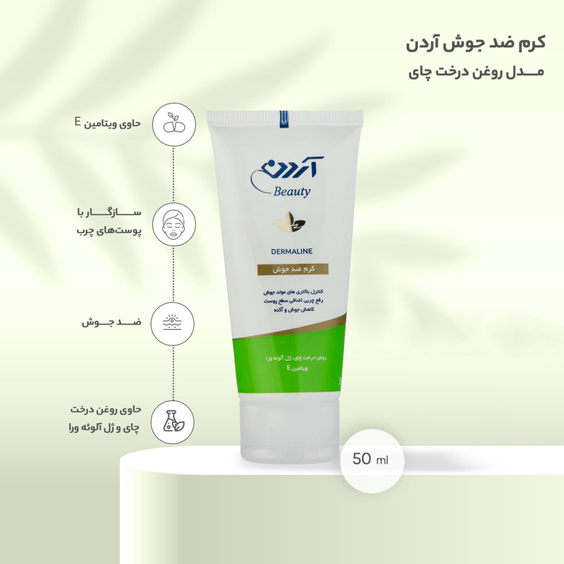 کرم ضد جوش آردن، کمک به رفع انواع آکنه و پیشگیری از ایجاد جوش کنترل باکتری های مولد جوش کرم ضد جوش آردن، کاهش جوش و آکنه حاوی روغن درخت چای ، ژل آلوئه ورا ،ویتامینE