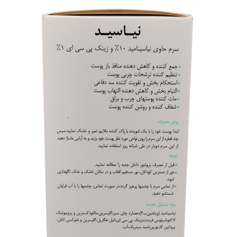 شرکت کیمیا فارمد گیتیگستر با سالها تجربه در حوزه فرمولاسیونهای پیشرفته و همکاری با کمپانیهای معتبر اروپایی، موفق به تولید سرم نیاسینامید ۱۰٪ و زینک PCA یک٪ شده است. این سرم با عملکرد چندگانه خود علاوه بر کاهش ترشح چربی و جمعکننده منافذ باز، در بهبود جوشهای مزمن و قدیمی، کاهش التهاب و قرمزی، تقویت سد دفاعی پوست و جلوگیری از براقیت آن نقش مؤثری دارد.