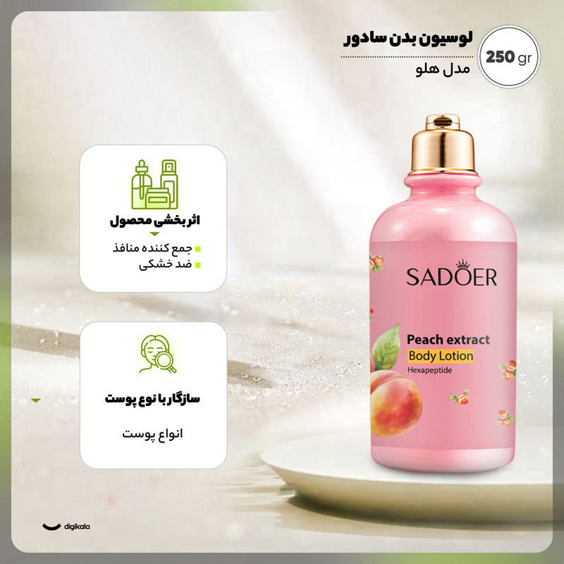 اگر پوست خشک یا حساسی دارید، لوسیون بدن میتواند بهترین گزینه مراقبتی برای شما باشد. لوسیون بدن هلو سادور با بافت سبک و بدون چربی اضافه، بهسرعت جذب میشود و پوست را بهطور عمیق آبرسانی میکند؛ نتیجه آن نرمی و رطوبت ماندگار است. این محصول علاوه بر مرطوبکنندگی، به کاهش منافذ باز، روشنتر شدن پوست و کاهش چینوچروک کمک میکند. فرمولاسیون ضد حساسیت و ضد التهاب آن، برای همه انواع پوست مناسب است. لوسیون هلو سادور در حجم ۲۵۰ گرم عرضه میشود و برای استفاده طولانیمدت گزینهای اقتصادی و کاربردی است.