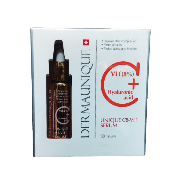سرم ویتامین سی درمایونیک Dermaunique Unique C8-Vit Serum دارای ویتامین C و هیالورونیک اسید می باشد. این سرم روشن کننده پوست و ضد لک می باشد. هیالورونیک اسید در حفظ رطوبت، ترمیم بافت ها و انعطاف پذیری پوست موثر می باشد. همچنین در رشد و ترمیم کلاژن و الاستین کمک میکند. هیالورونیک چین و چروک پوست را برطرف کرده و از پیری زودرس پوست جلوگیری می کند. اثر دیگر هیالورونیک اسید در آبرسانی پوست بوده و کمک می کند که رطوبت پوست حفظ شده و استحکام پوست افزایش یابد.