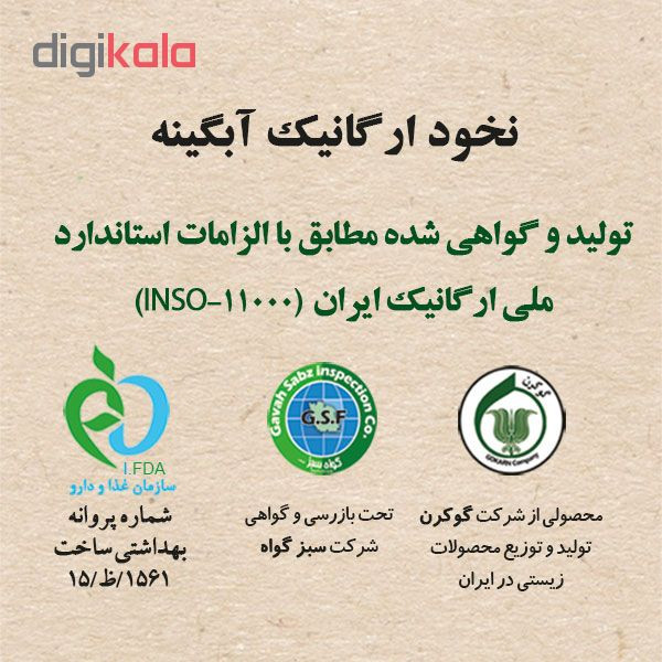 نخود (Chickpeas) حاوی مقادیر زیادی از ویتامین B4، ویتامین B6، ویتامین K، سلنیم، منیزیم و روی (زینک) است. که یک محصول ارگانیک این خواص را تمام و کمال با طعمی خوش به شما هدیه می دهد تا بر جسم و جانتان نشیند با مصرف نخود ارگانیک آبگینه، شما را به گذشته ها می بریم تا آن طعمی که از یادها رفته است را دوباره مزه کنید. اصیل، بومی، ایرانی... نخود ارگانیک آبگینه از جمله محصولات تولید شده در مزارع تحت پوشش شرکت گوکرن توسط کشاورزان رهرو در مسیر سلامت در مناطق مستعد و نسبتا بکر، با آب و هوای مساعد و خاک مناسب می باشد. این محصول مطابق با تولید وگواهی شده مطابق با الزامات استاندارد ملی ارگانیک ایران (INSO-11000) و سلامت محور، همچنین اصول اخلاقی صورت میپذیرد و در نهایت براساس تعهدات و شالوده ی خاص مجموعه گوکرن، با هدف ایفای نقش در سلامت و ایمنی غذایی عموم مردم عرضه می گردند. جهت حمایت از خانواده های کم استعاعت و زنان سرپرست خانوار، بوجاری و دستچین کردن نخود ارگانیک آبگینه به دستان مهربانوان سرزمینمان سپرده شده است تا طعم ناب و اصیل این حبوبات در کنار توانمندسازی و اشتغال زایی به شما عرضه گردد.