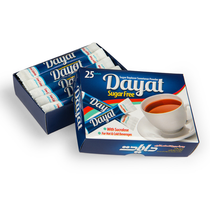 پودر شیرین کننده دایات در بسته های 25 و 100 عددی در بازار موجود می باشد .