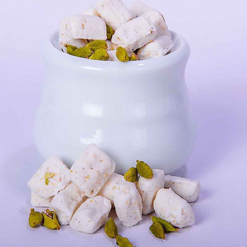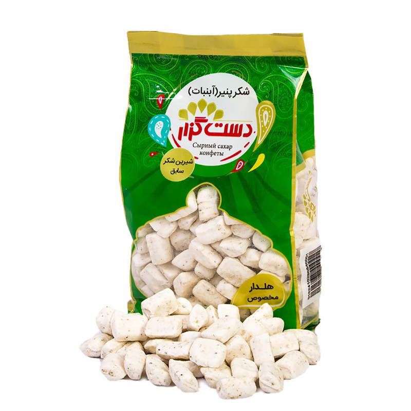 شکر پنیر ترکیبی از آب وشکر است که میگذارند جوش بیاید؛ و به درجه ای از قوام برسد. وقتی آماده شد بر روی سنگ بار آن را پهن میکنند وآنرا مرتب دو نفر از دو طرف میکشند تا قرمزی شکر به سفیدی مبدل شود. بعد آن را میبرند با قیچی تا به صورت گرد وچهار گوش شود. بعد آن را در بین آرد میریزند تا رس کند و برا ی خوشمزه شدن آن به آن انواع اسانس مثل هل وپرتقال و... میزنند.