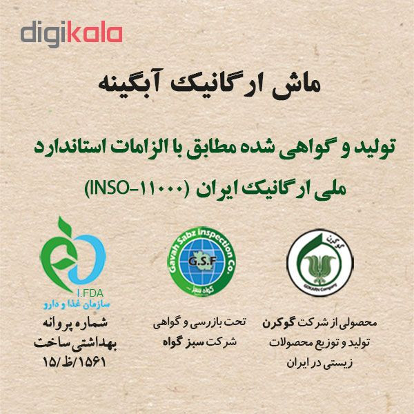 ماش (Mung bean) سرشار از آنتی اکسیدان بوده و برای پیشگیری سکته قلبی، کاهش کلسترول خون، فشار خون، کاهش قند خون و کنترل دیابت مناسب می باشد. که یک محصول ارگانیک این خواص را تمام و کمال با طعمی خوش به شما هدیه می دهد تا بر جسم و جانتان نشیند. با مصرف ماش ارگانیک آبگینه، شما را به گذشته ها می بریم تا آن طعمی که از یادها رفته است را دوباره مزه کنید. اصیل، بومی، ایرانی... ماش ارگانیک آبگینه از جمله محصولات تولید شده در مزارع تحت پوشش شرکت گوکرن توسط کشاورزان رهرو در مسیر سلامت در مناطق مستعد و نسبتا بکر، با آب و هوای مساعد و خاک مناسب می باشد. این محصول مطابق با تولید وگواهی شده مطابق با الزامات استاندارد ملی ارگانیک ایران (INSO-11000) و سلامت محور، همچنین اصول اخلاقی صورت میپذیرد و در نهایت براساس تعهدات و شالوده ی خاص مجموعه گوکرن، با هدف ایفای نقش در سلامت و ایمنی غذایی عموم مردم عرضه می گردند. جهت حمایت از خانواده های کم استعاعت و زنان سرپرست خانوار، بوجاری و دستچین کردن ماش ارگانیک آبگینه به دستان مهربانوان سرزمینمان سپرده شده است تا طعم ناب و اصیل این حبوبات در کنار توانمندسازی و اشتغال زایی به شما عرضه گردد.
