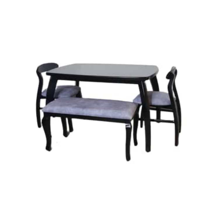 میز مدل بوگاتی پایه ها چوب روس صفحه ام دی اف ابعاد میز 80در120سانت ابعاد نیمکت 37در87سانت رنگ پارچه ثابت برای صندلی ها مشکی و برای نیمکت راه راه سفید و مشکی تنوع انتخابی برای رنگ چوب میباشد
