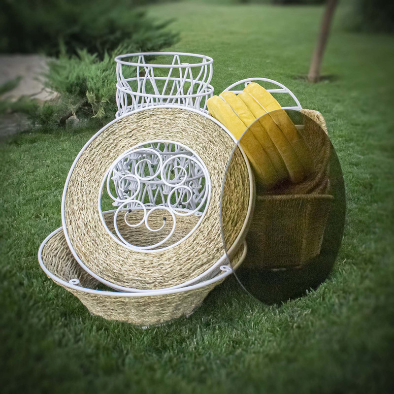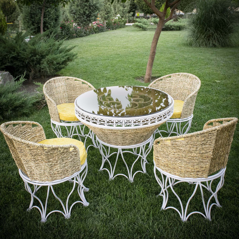 تشک صندلی های مبلمان باغی مدل پافیلی از جنس فوم با روکش مخمل می باشد. قسمت پشتی های صندلی با حصیر بافته شده است.