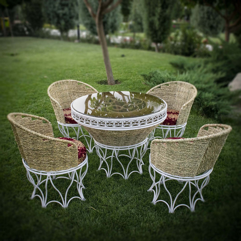 توضیحات صندلی : تشک صندلی های مبلمان باغی مدل پافیلی از جنس فوم با روکش مخمل می باشد. قسمت پشتی های صندلی با حصیر بافته شده است.