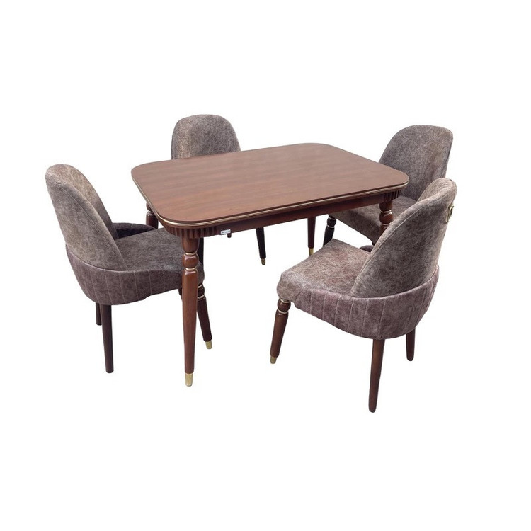 میز 4 نفره میباشد ب همراه 4 عدد صندلی میز و پایه ها ب صورت اتصالی میباشد و جدا میباشد رنگ چوب ثابت میباشد همانند عکس تنوع برای پارچه میباشد . ابزار طلایی برای میز و صندلی ها ب کار میرود