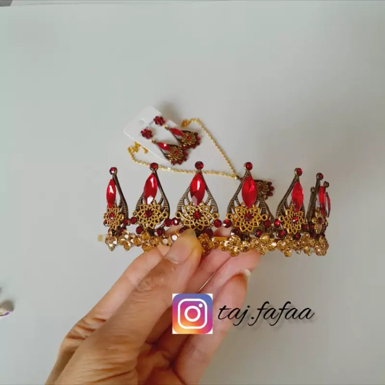 تاج عروس تاج قرمز 2 با گوشواره و گردنبند