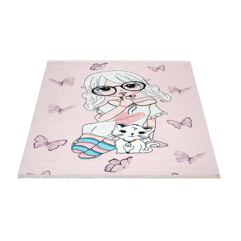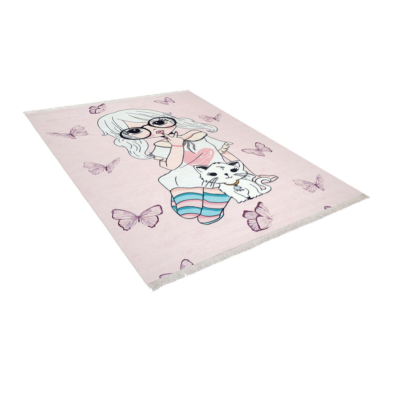 فرش ماشینی زانیس مدل اتاق کودک طرح دختر با پیشی زمینه صورتی