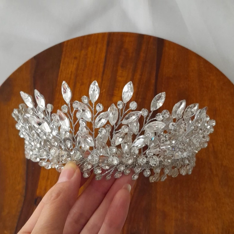 تاج عروس.رنگ نقره ای.بسیار شاین و درخشان.ساخته شده از سنگ های اصل .ارتفاع تاج پنج و نیم سانت.