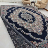 روفرشی 6 متری مخمل زرک دار و براق- ضخامت متوسط طرح حوض نقره رنگ سرمه ای برند وکیل بافت یزد کد نیلوفر 004 - روفرشی 6متری