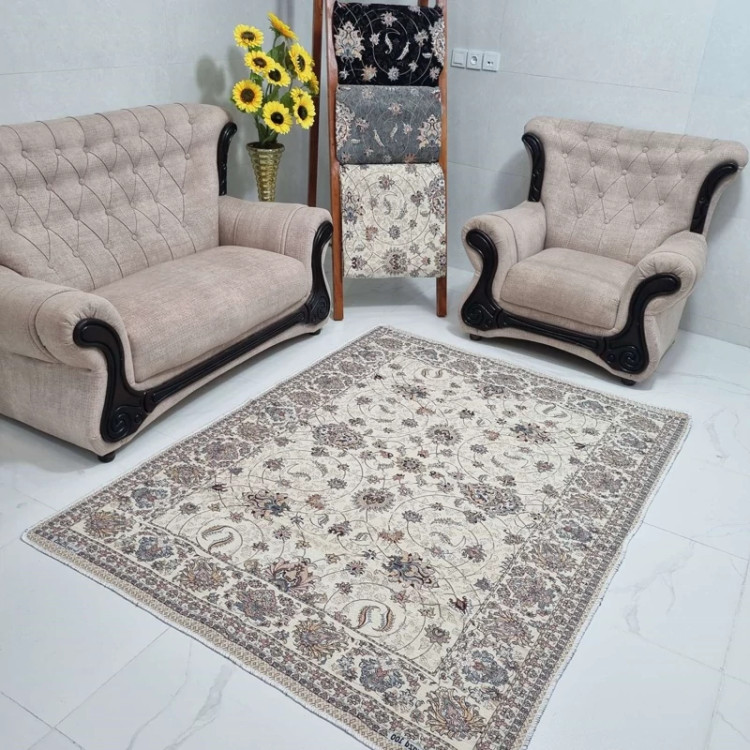روفرشی 3 متری شانل ابریشم ضخیم یکرو طرح افشان کد گلنگار 100 رنگ کرم برند وکیل بافت یزد