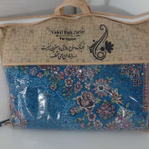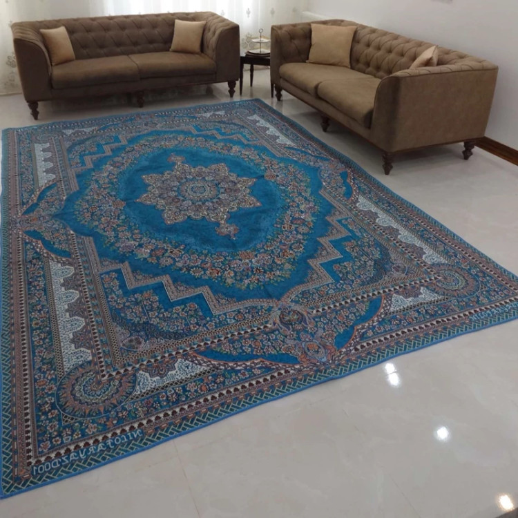 روفرشی 6 متری مخمل زرک دار یا براق - ضخامت متوسط طرح باغ بهشت آبی فیروزه برند وکیل بافت یزد کد نیلوفر 001 - روفرشی 6متری