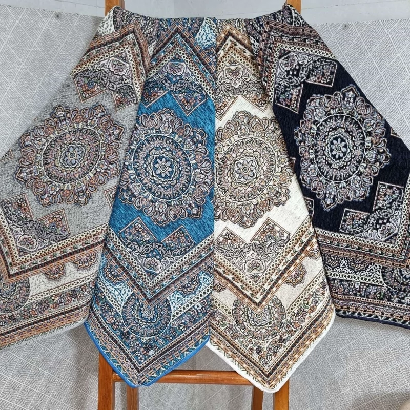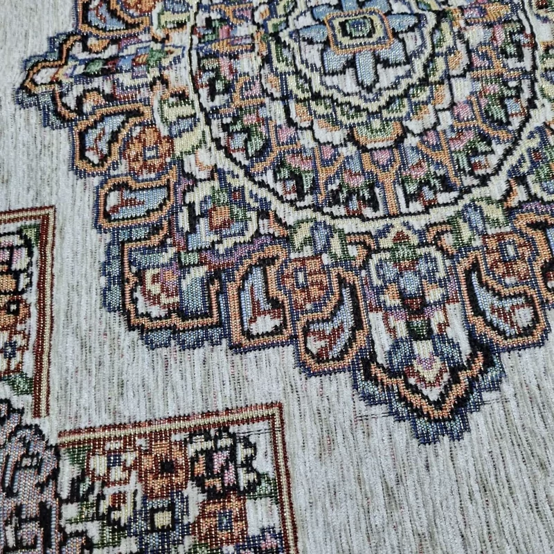 ◀️ این کار هم جنس روفرشی مخملی، زرکدار و براق است...چرا که در بافت آن علاوه بر نخ مخمل، از نخ لمهای و براق نیز استفاده شده که باعث شده تا سطح روفرشی براق و اِکلیلی به نظر بیاید و زیبایی و جلوه خاصی داشته باشد...