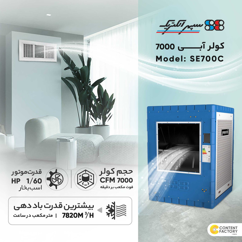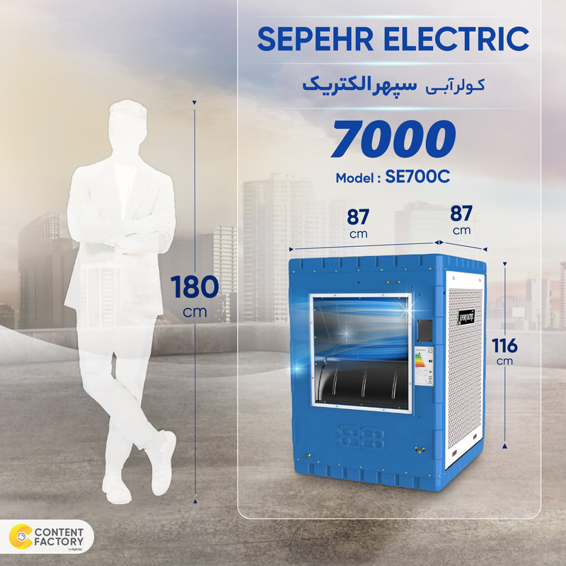کولر آبی 7000 سپهر الکتریک مدل SE700C یک دستگاه خنک کننده قدرتمند با ویژگیهای منحصر به فرد است. این کولر آبی با ابعاد 116x87x87 سانتیمتر و وزن 84.5 کیلوگرم مناسب برای استفاده در محیطهای بزرگ و متوسط است. بدنه آن از جنس گالوانیزه تهیه شده بنابراین از دوام و مقاومت بالایی برخوردار است. کولر آبی 7000 سپهر الکتریک مدل SE700C دارای حجم 7000 CFM است که میزان بالایی از هوادهی و تهویهی مناسب را ارائه میدهد. ولتاژ ورودی برق آن 220 ولت است که معمولاً در بیشتر محیطها میتوان از این ولتاژ استفاده کرد. همچنین، حداکثر قدرت باددهی آن 7820 متر مکعب در ساعت است، که نشاندهنده قدرت بالای خروجی هوا در این دستگاه است.