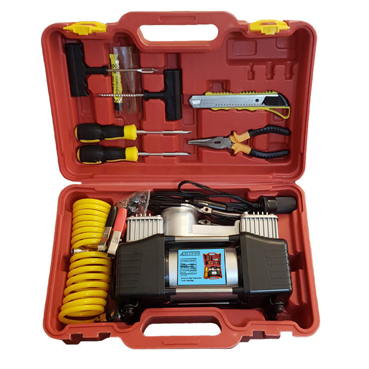 - سه سری نازل باد - شلنگ فنری - کیف - کاتر - 1 عدد پیچ گوشتی دوسو - 1 عدد پیچ گوشتی چهارسو - 1 عدد دم باریک - چسب مایع - ابزار پنچرگیری - گیره باتری خودرو به همراه کابل - جعبه مخصوص با قابلیت قرار دادن کلیه متعلقات - وزن جعبه: 3.376 کیلوگرم