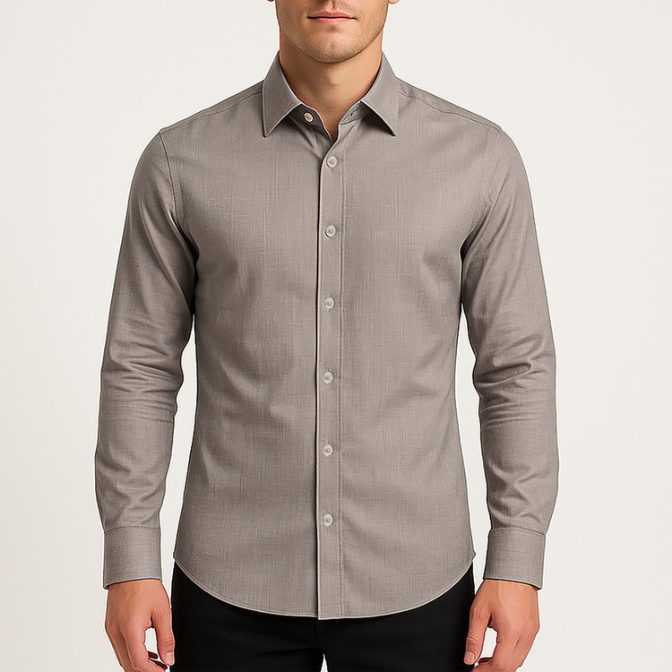 پیراهن مردانه آستین بلند پارچه ترکیبی از الیاف پنبه و لینن دارای دکمه مخفی زیر یقه استایل Slim-Fit آستین دو دکمه ثبات رنگ در شستشو