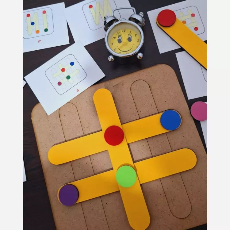 الگو ها را در اختیار کودک میگذارید و از آن ها میخواهید طبق الگو چوب بستنی ها را بر روی پالت بچینند.