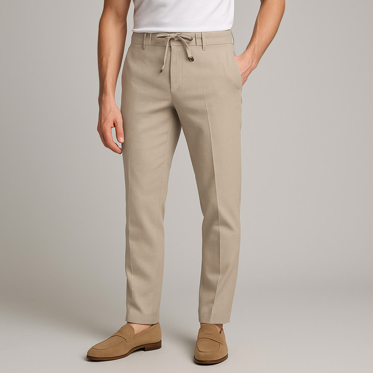 شلوار پارچه ای مردانه لینن استایل Custom-Fit پیش کار تک دکمه دارای کمربند جهت فیت کردن دور کمر الیاف خنک و سبک