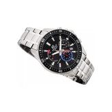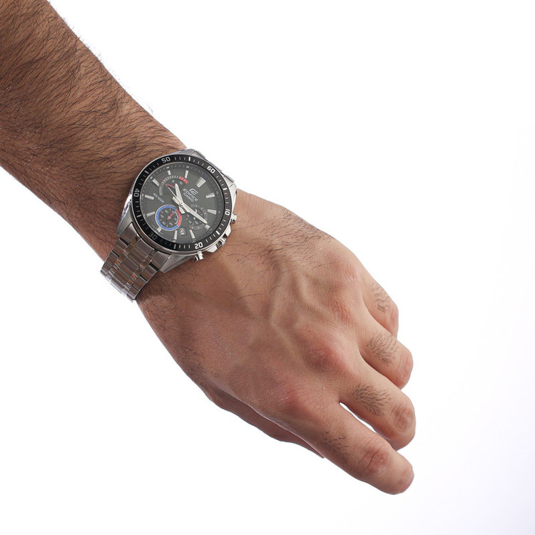 ساعت مچی عقربهای «کاسیو» مدل «Casio EFR-552D-1A3VUDF» از ساعتهای کلاسیکاسپرت شیک و بسیار جذاب این برند ژاپنی است که صفحهای مشکی، عناصری هیجانانگیز و در کل کیفیت و ارزش خرید بالایی دارد. این ساعت که در سری ساعتهای «ادیفایس» (Edifice) دستهبندی میشود، دارای قابی با عرض تقریبی 47 میلیمتر است که سایز نسبتا بزرگ و البته قابلقبول برای این سبک از ساعتهای مردانه محسوب میشود. بر روی صفحهی بزرگ ساعت، شاهد چهار شمارشگر هستیم که به قابلیتهایی مختلف مربوط میشوند. در بین نشانگرهای ساعت چهار و پنج، شاهد یک تاریخشمار با ارقام مشکیرنگ هستیم که شاید کاربردیترین قابلیت ساعت به شمار آید. در بالای این تاریخشمار هم شاهد صفحهای برای نمایش حالت 24 ساعته هستیم که در کنار زیبایی و کارایی معمول برای تنظیم سریعتر تاریخشمار نیز استفاده میشود. دو شمارشگر دیگر که یکی از آنها به صورت نیمگرد (retro-grade) طراحی شده به قابلیت مهم کرنوگراف یا زمانسنج مربوط میشوند. این مدل با توجه به موتور کوارتز ژاپنی، بند و بدنهی استیل و مقاومت بالا در برابر آب کیفیت و ماندگاری قابلتوجهی دارد. با مقاومت در برابر آب تا فشار ده بار یا صد متر در تقریبا تمام موقعیتهای روزمره، از شستوشوی دست گرفته تا مواردی که ممکن است ساعت کمی بیشتر با آب در تماس باشد، از نفوذ آب به بدنه جلوگیری خواهد شد. در مجموع اگر قصد خرید یک ساعت کلاسیکاسپرت باکیفیت و ماندگار را دارید، این مدل با مشخصات ذکرشده و کیفیت و ماندگاری بالا، انتخابی عالی و هدیهای باارزش خواهد بود.