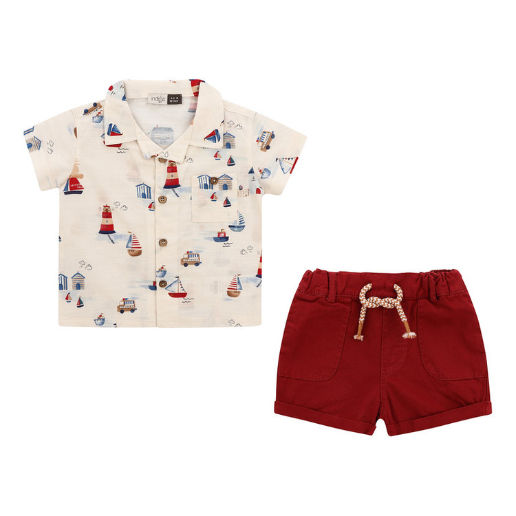 این ست شامل یک عدد پیراهن دکمهدار آستین کوتاه و شلوارک کمرکش است.
