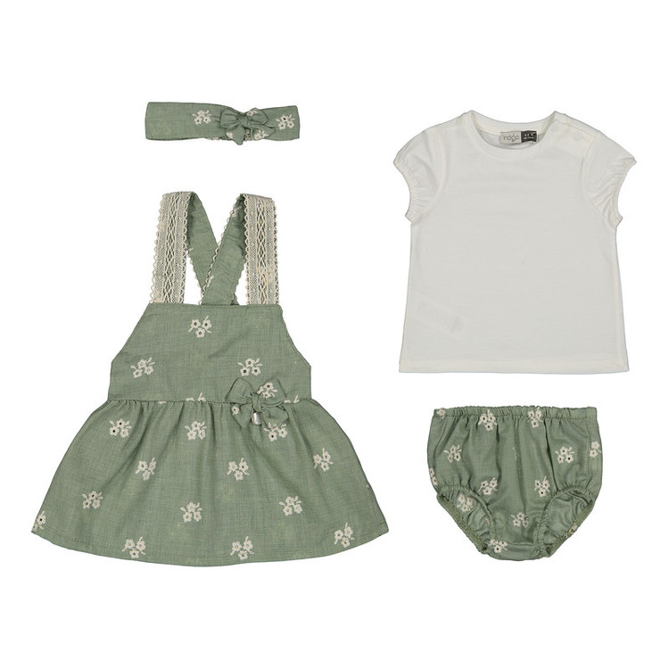 این ست شامل یک عدد سارافون دوبندی نخی، تی شرت آستین کوتاه، هدبند و شورت است.