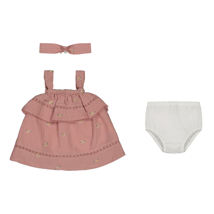 ست شامل پیراهن، شورت و هدبند است.