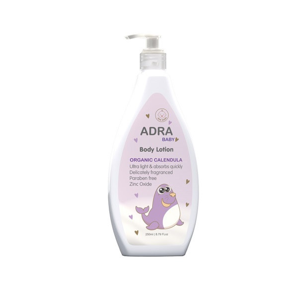 لوسیون بدن کودک آدرا حاوی عصاره کالاندولا و زینک اکساید بوده که ترمیم کننده و ضد التهاب میباشد خاصیت نرم کننده و مرطوب کنندگی دارد و محافظ و شاداب کننده پوست بوده و فاقد پارابن میباشد