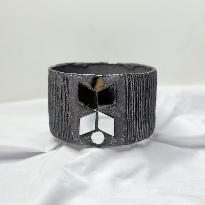 گلدان شیشه ای با دهان گشاد که مناسب برای گل خشک و دکوراتیو یا گل با آب می باشد. سطح بیرونی گلدان با خمیر پاپیه ماشه طرح دار شده و از آینه های تزیینی کوچک برای جلوه بیشتر استفاده شده است. طرح کلی کار به صورت گلدان سنگی یا سفالی به نظر میآید، ازنظر مقاومت این خمیر جادویی بعد از خشک شدن استقامت کافی برای ضربه را دارا میباشد