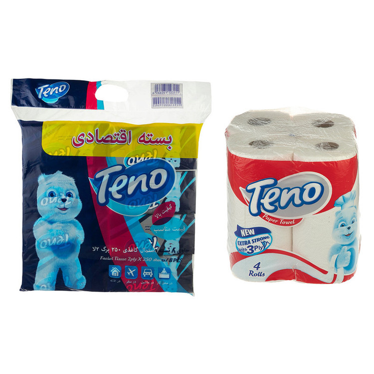 - این محصول مجموعا شامل یک بسته 8 عددی دستمال کاغذی 250 برگ 2 لایه ی تنو و یک بسته 4 عددی دستمال حوله ای 3 لایه تنو می باشد.