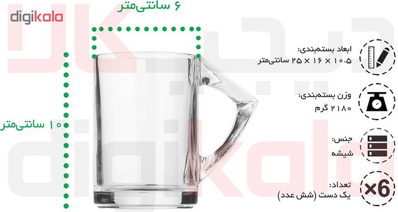 سایر توضیحات : - لیوان دسته‌دار - هر لیوان دارای قطر 6.5 سانتی‌متر و ارتفاع 10 سانتی‌متر - وزن هر لیوان 335 گرم
