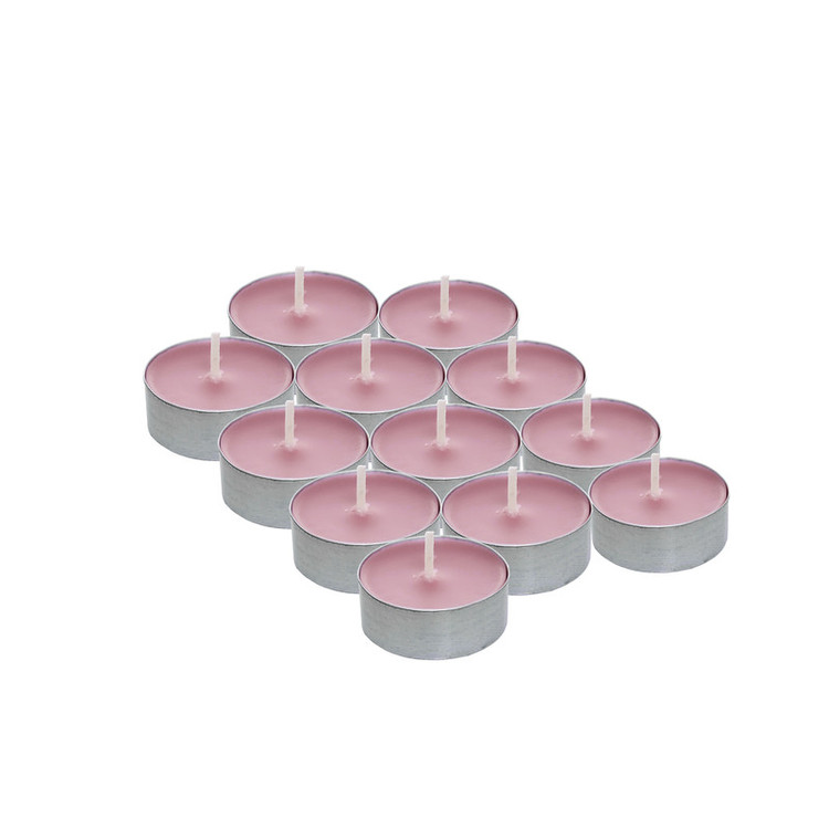 شمع وارمر صورتی بسته بندی 12 عددی مناسب برای دکوراسیون و آراستن میز غذا دارای فریم فلزی دور شمع شعله روشن و یکنواخت بدون دود مناسب برای گرم نگه داشتن غذا و قوری چای