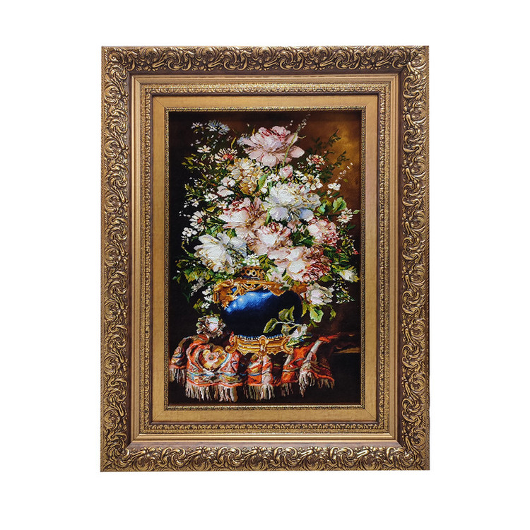استفاده شده از رنگ های سنتی بارنگ طبیعی با کیفیت بسیار اعلا و رنگ ثابت گل ابریشم کف غرق در ابریشم