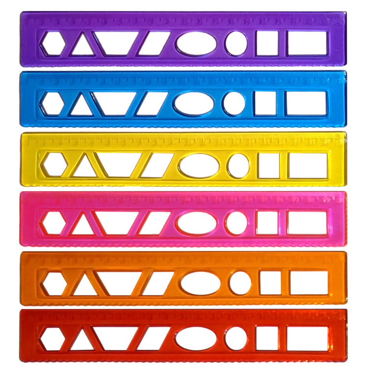 - 6 عدد خط کش شابلون دار در 6 رنگ - یک طرف هر خط کش مدرج و طرف مقابل موجی شکل - وزن هر خط کش 17 گرم (وزن 6 خط کش 102 گرم) - ضخامت هر خط کش 2.5 میلیمتر - جنس خط کش ها از پلاستیک ژله ای و شفاف