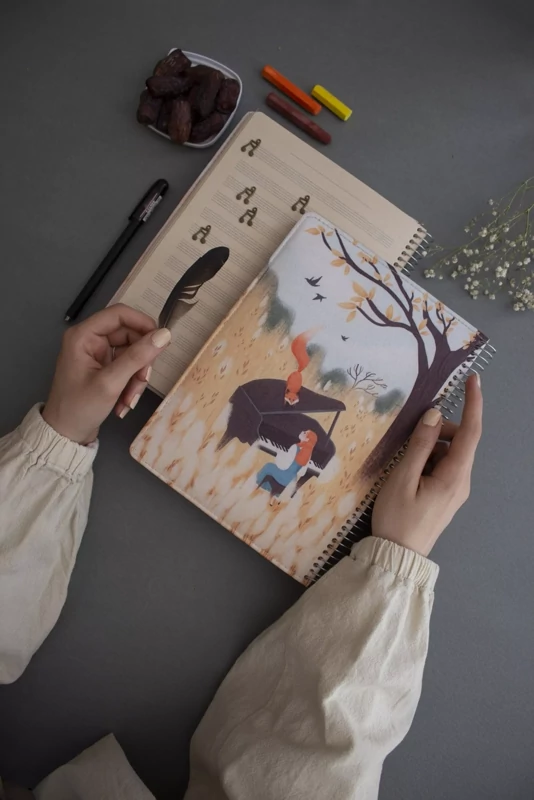 دفتر نوت نویسی با 5 خط حامل و سایز استاندارد تعریف شده است. برخلاف دفتر نُت های موجود در بازار سایز مناسب و تعداد زیاد برگه ها به مخاطب در روند نُت نویسی فضای کافی داده و فنری بودن این دفاتر استفاده از آن را به مراتب راحت تر خواهد کرد.