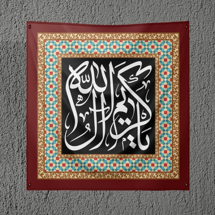 پرچم مذهبی طرح یا کریم الله با چاپ قابل شستشو با پارچه ساتن ضخیم و دور دوزی شده با جای چوب