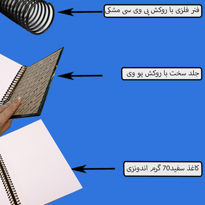 ابعاد دفتر 15 × 20 سانتی متر یا قطع A5 است .