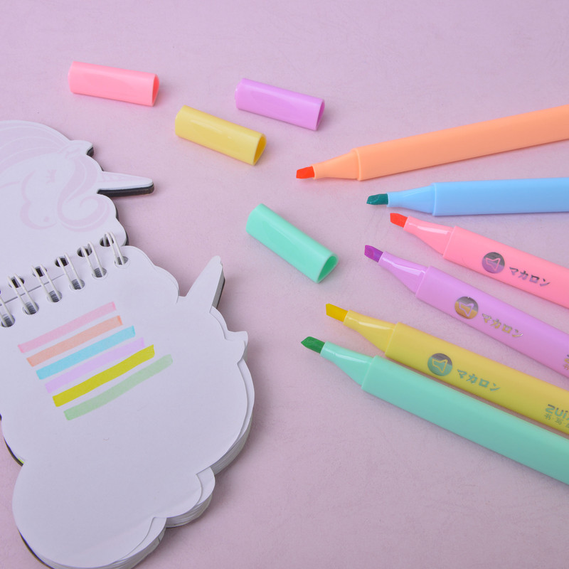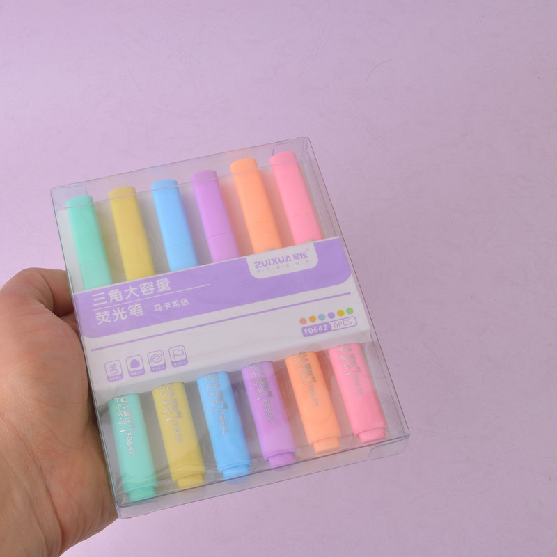 6 عدد ماژیک هایلایتر با فرم هرمی شکل با رنگ بسیار نرم و پاستلی کمرنگ که در یک بسته بندی طلقی مطابق با تصاویر قراردارد . توجه داشته باشید رنگ هایلایترها تقریبا نرم و ملایم میباشد و کاملا مناسب برای علامت گذاری و خط کشی روی نوشته ها و متون میباشد .