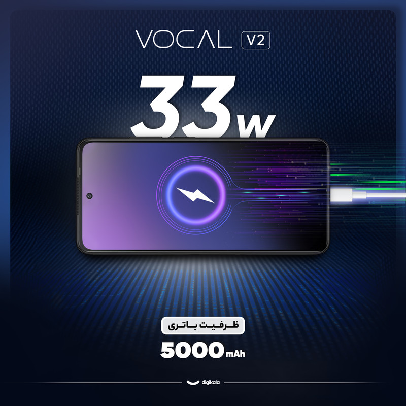 Vocal V2 به یک باتری ۵۰۰۰ میلیآمپرساعتی مجهز شده است که امکان شارژ سریع ۳۳ واتی دارد و نیازهای کاربران را در طول یک روز به طور کامل تأمین میکند. در مجموع این گوشی برای افرادی که به دنبال عملکرد قابل قبول و امکانات متنوع در یک مدل اقتصادی هستند، انتخابی عالی است.