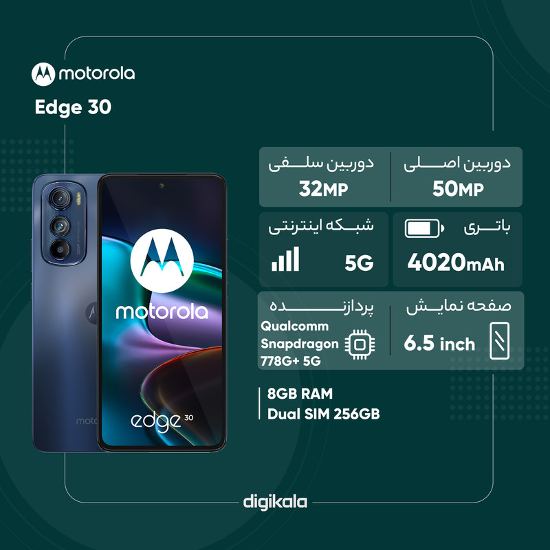 سری Edge گوشیهای هوشمند موتورولا را به عنوان پرچمداران این سری میشناسیم و توانستهاند با بهره بردن از مشخصات فنی مناسب، عملکرد بسیار خوبی را بهنمایش بگذارند. البته لازم به ذکر است که پرچمداران موتورولا به نسبت دیگر گوشیهای پرچمدار قیمتی مقرون بهصرفهتری دارند. موتورولا Edge 30 یکی از گوشیهای باکیفیت این شرکت است که از مشخصات فنی بسیار خوبی مجهز شده است. در نمای روبهرویی این گوشی به صفحهنمایش با ابعاد 6.5 اینچ و رزولوشن 1080×2400 پیکسل از نوع امولد مجهز شده است. باید بدانید که این گوشی به یکی از قدرتمندترین صفحاتنمایش در بین گوشیهای هوشمند مجهز شده است و برای تایید این جمله باید بدانید که این صفحهنمایش توانایی نمایش 405 پیکسل در هر اینچ و نرخ بروزرسانی 144 هرتز را دارد. چنین نرخ بروزرسانی را بیشتر در گوشیهای هوشمند گیمینگ رده بالای بازار دیده بودیم. بریدگی دایرهای شکل ناچ در قسمت بالایی و مرکزی صفحهنمایش سنسور دوربین سلفی با رزولوشن 32 مگاپیکسل را در خود جای داده که نکته جالب این سنسور دوربین سلفی، توانایی ضبط ویدیو با حداکثر کیفیت 4K و سرعت 30 فریم در ثانیه است. در قسمت پشتی هم یک سنسور دوربین اصلی با رزولوشن 50 مگاپیکسل از نوع عریض مجهز به لرزشگیر OIS در کنار سنسور قدرتمند 50 مگاپیکسل فوق عریض (ultrawide) با زاویه دید 118 درجه و سنسور 2 مگاپیکسل سنجش عمق، سنسورهای دوربین سهگانه این گوشی هوشمند را تشکیل میدهند. پردازنده قدرتمند اسنپدراگون 778G+ 5G شرکت کوالکام هم این گوشی را همراهی میکند و باید خیالتان راحت باشد که به لطف حضور این پردازنده، موتورولا Edge 30 توانایی ارائه عملکرد بسیار خوبی را در اجرای سنگینترین بازیهای روز دنیا دارد. باتری 4020 میلیآمپرساعت در کنار پشتیبانی از فناوری شارژ سریع با توان 33 وات هم از دیگر مشخصات در نظر گرفته شده هستند. در مجموع باید بگوییم که اگر به دنبال خرید گوشی هوشمند قدرتمندی هستید که توانایی ارئه عملکردی در حد و اندازه گوشیهای پرچمدار و رده بالا را داشته باشد و از طرفی قیمتی مقرون بهصرفه هم داشته باشد، موتورولا Edge 30 میتواند یکی از انتخابهای شما باشد.