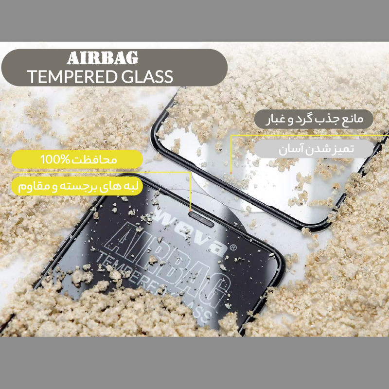 گلس ایربگ، از جنس شیشه ی حرارت دیده ی فشرده شده، با مقاومت 9H است.این گلس با حاشیه ی مشکی برآمده در لبه های آن، مانند ایربگ عمل کرده و هر گونه ضربه روی صفحه نمایش را خنثی می کند و مانع آسیب رسیدن به صفحه نمایش گوشی شما می شود. این مدل گلس از شفافیت بالایی برخوردار بوده و 99 درصد نور صفحه نمایش را به چشم بیننده انتقال می دهد.