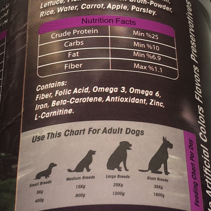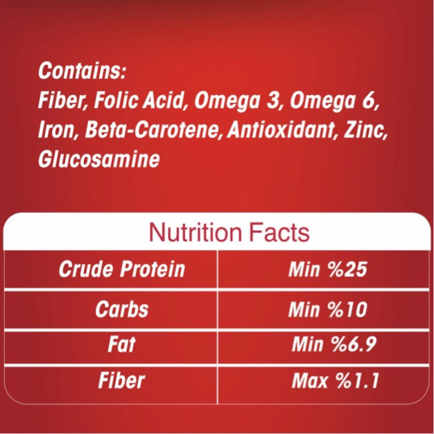 این کنسرو با توجه به داشتن پروتئین و فیبر لازم و مواد مغذی کاملا طبیعی برای تمامی سنین مناسب است.این کنسرو فاقد از افزودنیهای شیمیایی، مواد نگهدارنده، طعم دهندهها و رنگ دهندههای مصنوعی است. این کنسرو فاقد شکر، نمک و گلوتن میباشد و در آن از پر کنندهها (Filler) استفاده نشده است و به دلیل وجود افزودنیهای طبیعی (گلوکوزامین و زینک) باعث استحکام استخوان در تمامی سنین میشود. این ترکیبات با توجه به داشتن مقدار قابل ملاحظهای از امگا 3 و 6 به نگهداری سلامت پوست و مو و همچنین رشد مو کمک قابل توجهی مینماید. این وعده غذایی حاوی پروتئین، کربوهیدرات، مواد معدنی، فیبر و چربی، ترکیب مایعات و افزودنیهای طبیعی مغذی است